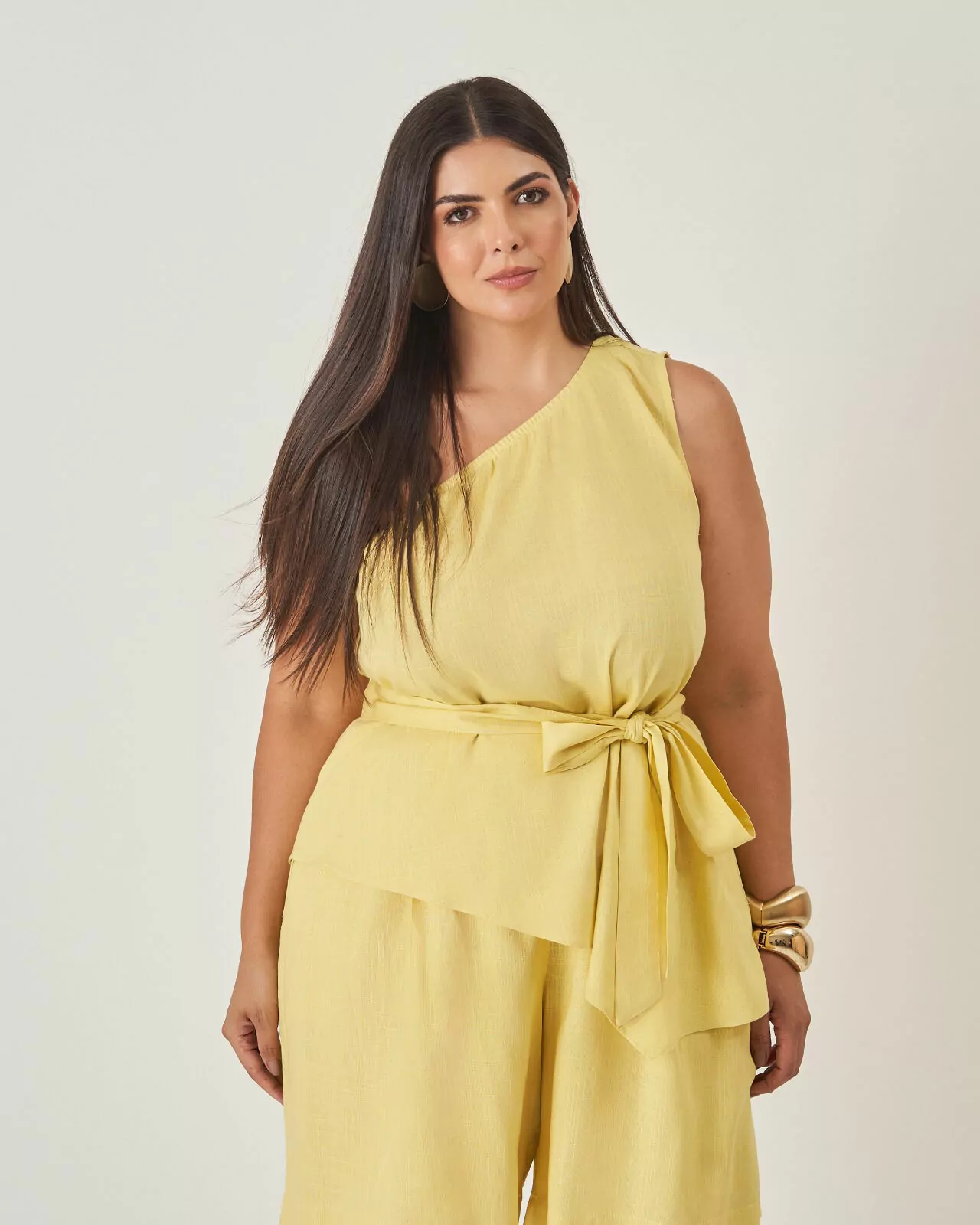 Blusa alongada em viscose com recorte assimétrico, um ombro só. Acompanha faixa para amarração.