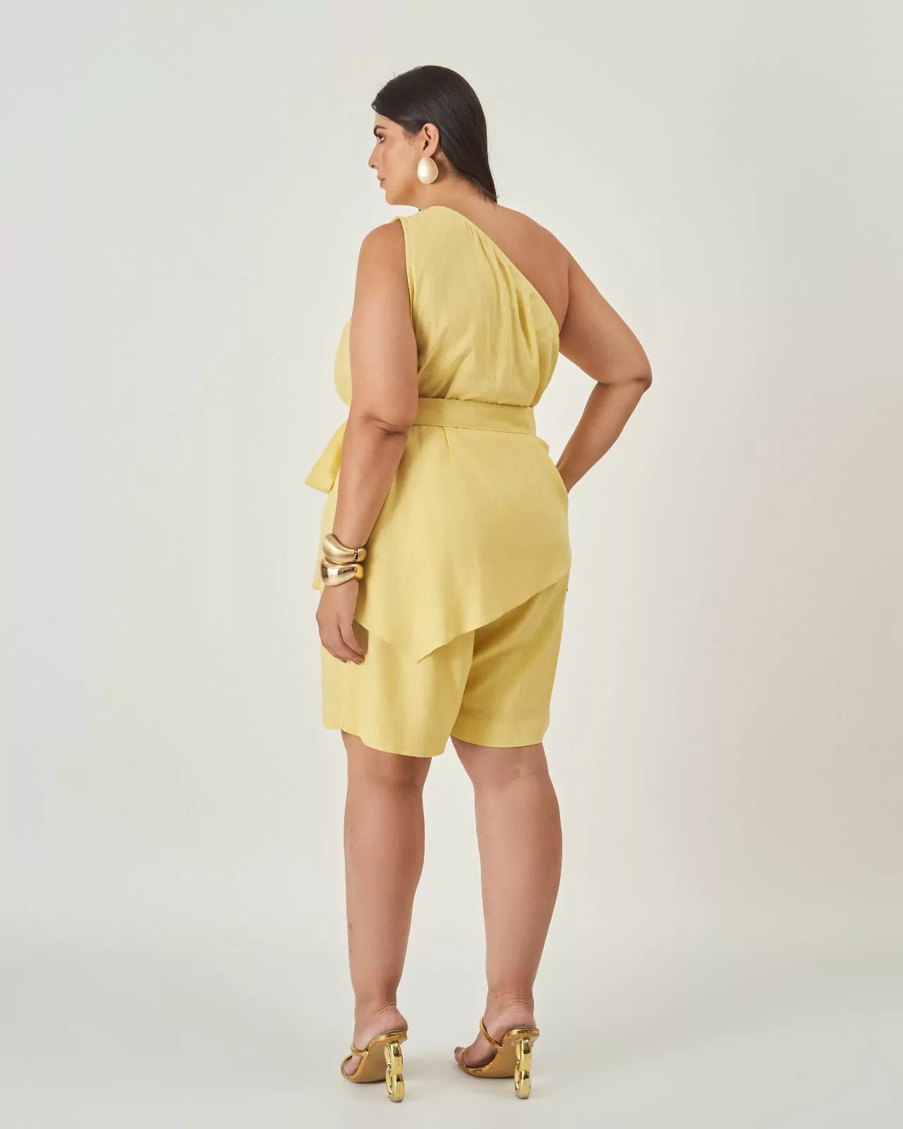 Blusa alongada em viscose com recorte assimétrico, um ombro só. Acompanha faixa para amarração.