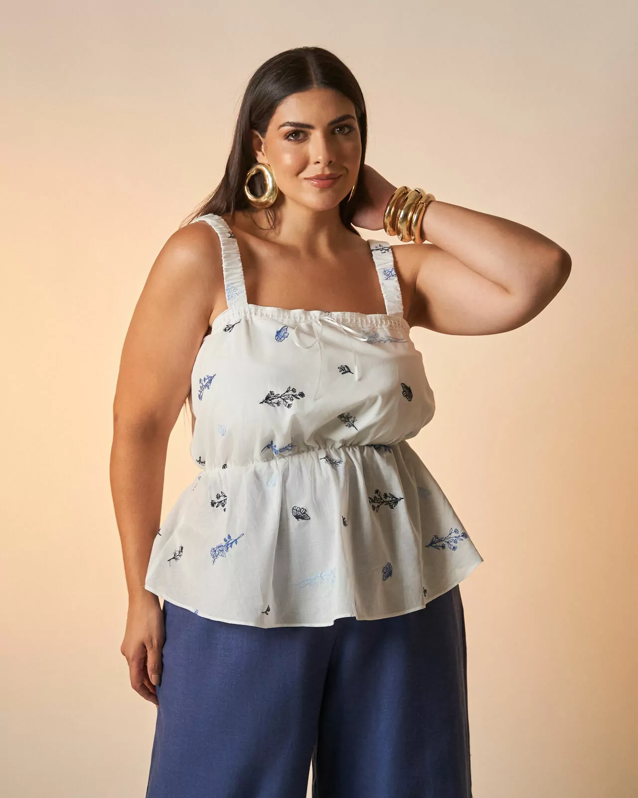 Bata em algodão bordado com alças em elástico, decote reto com detalhes de aviamento e amarração em cetim. Possui elástico em toda circunferência da cintura e forro na parte do busto.