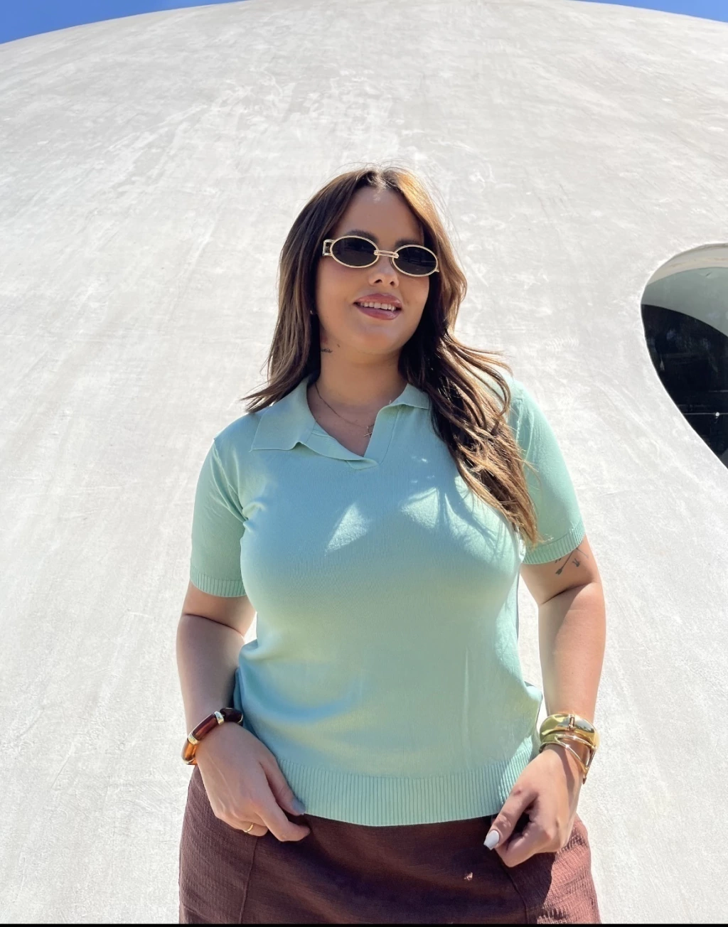 Blusa estilo polo em malha de tricot com detalhes de punho de retilínea na barra da blusa e barra da manga.