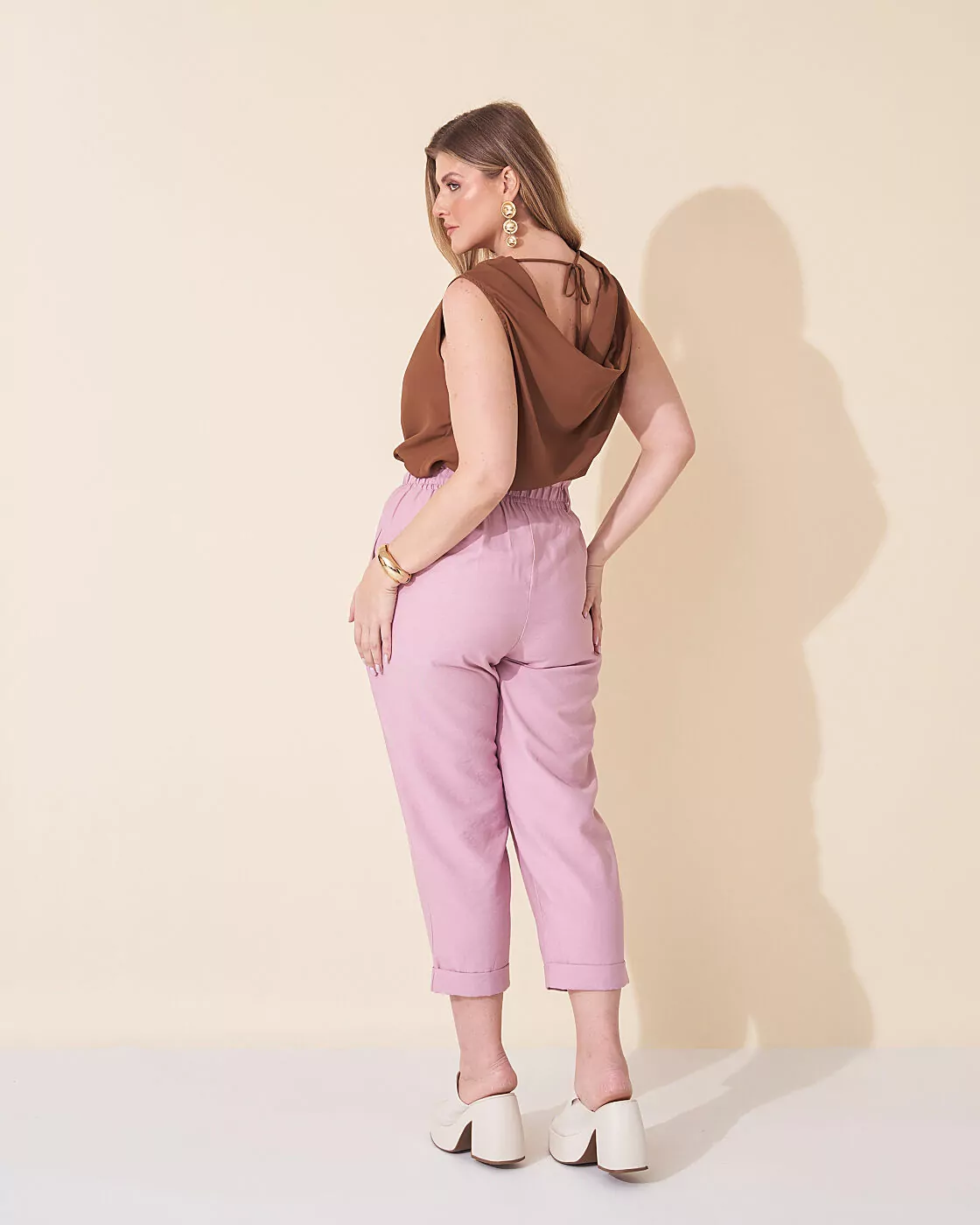 Blusa em poliéster com detalhe de gola boba em tecido leve e fresco . Possui amarração costas.