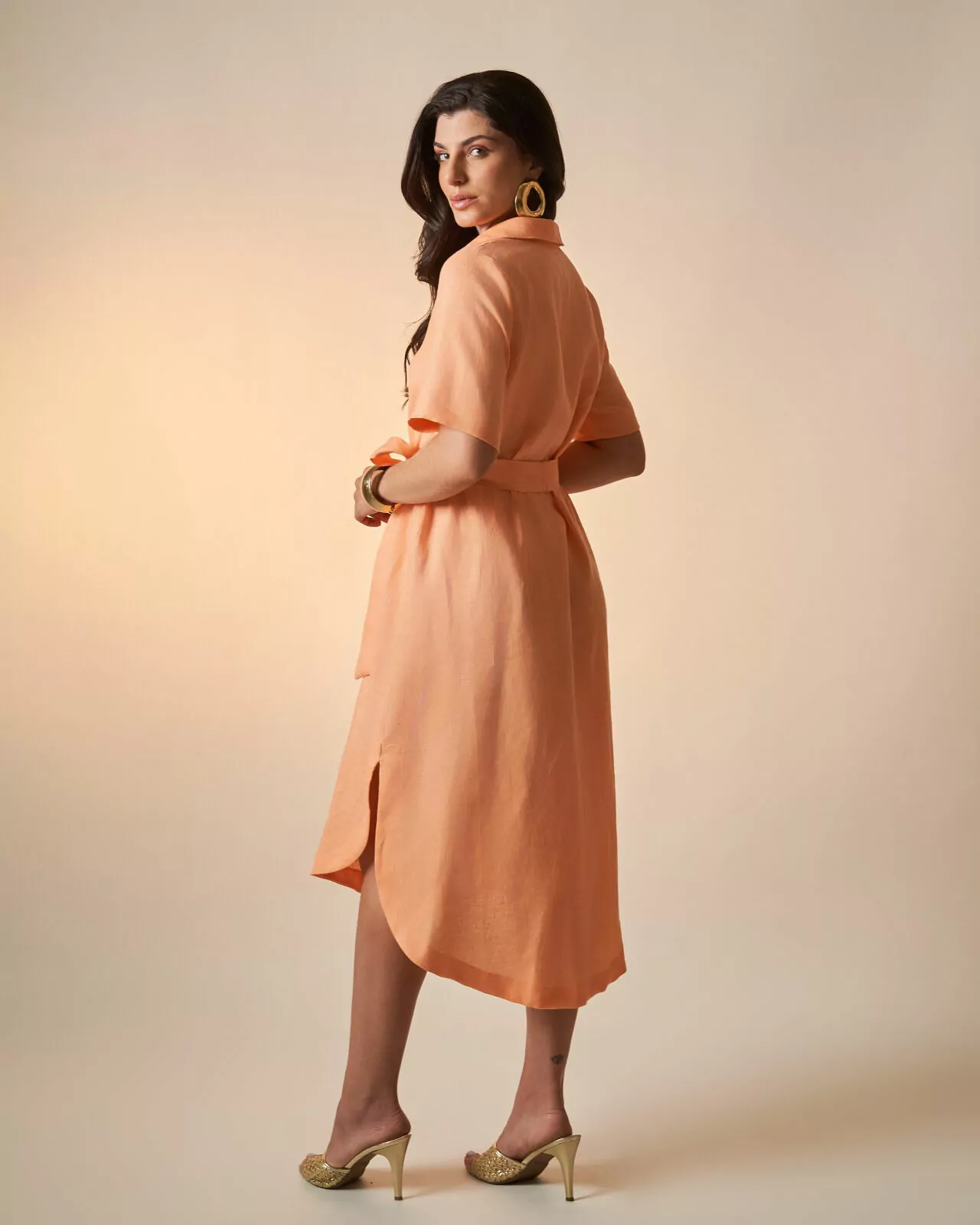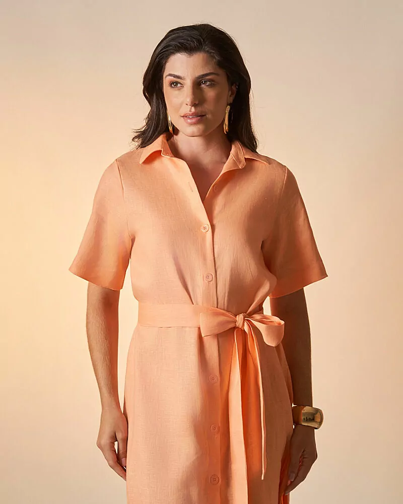 Chemise midi alongada em viscose com linho. Possui botões tingidos na vista e abertura lateral. acompanha faixa para amarração