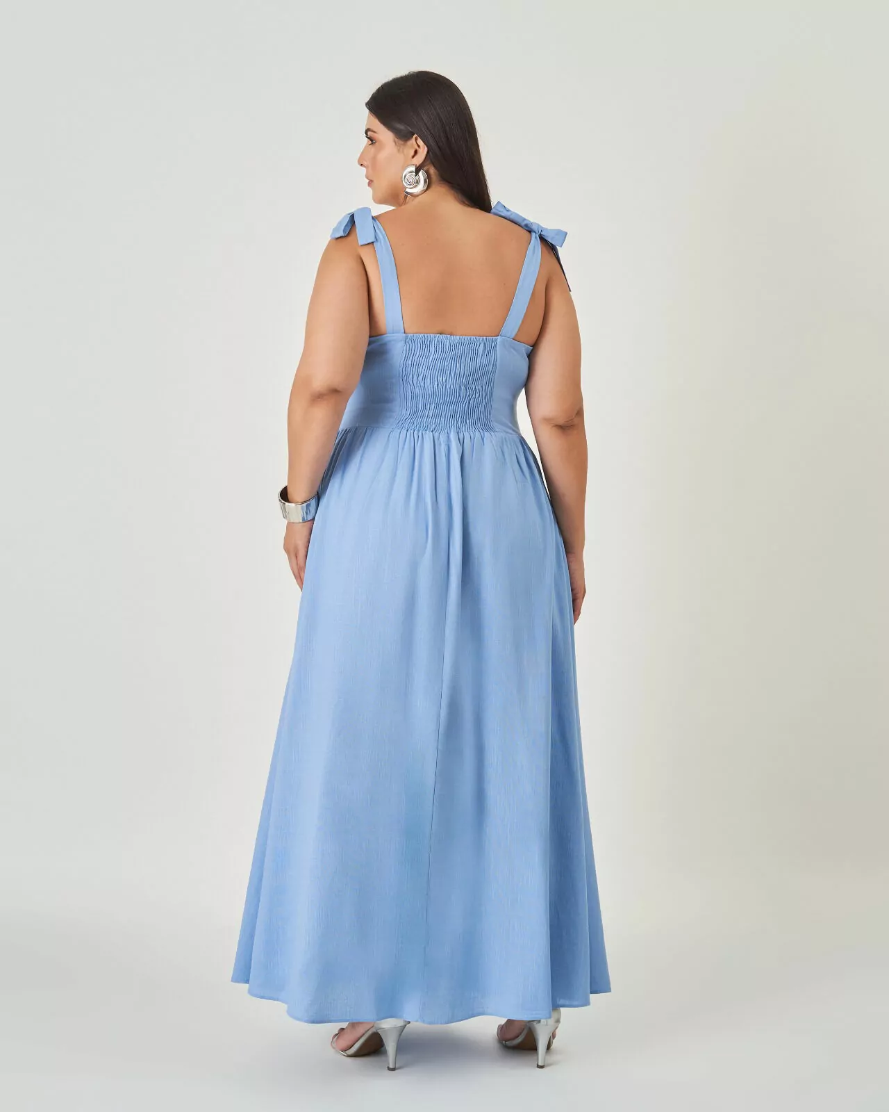 Vestido midi alongado com alças para amarração , possui recortes no busto e leve franzido na saia. Possui elastéx costas e forro.