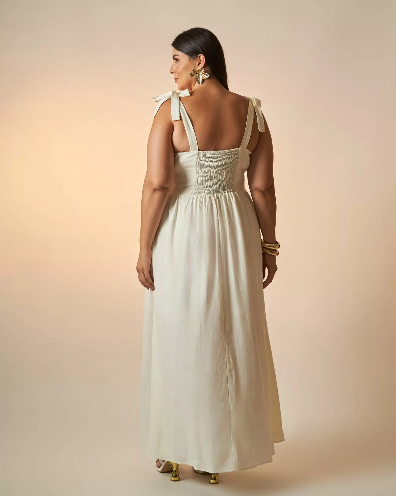 Vestido midi alongado com alças para amarração , possui recortes no busto e leve franzido na saia. Possui elastéx costas e forro.