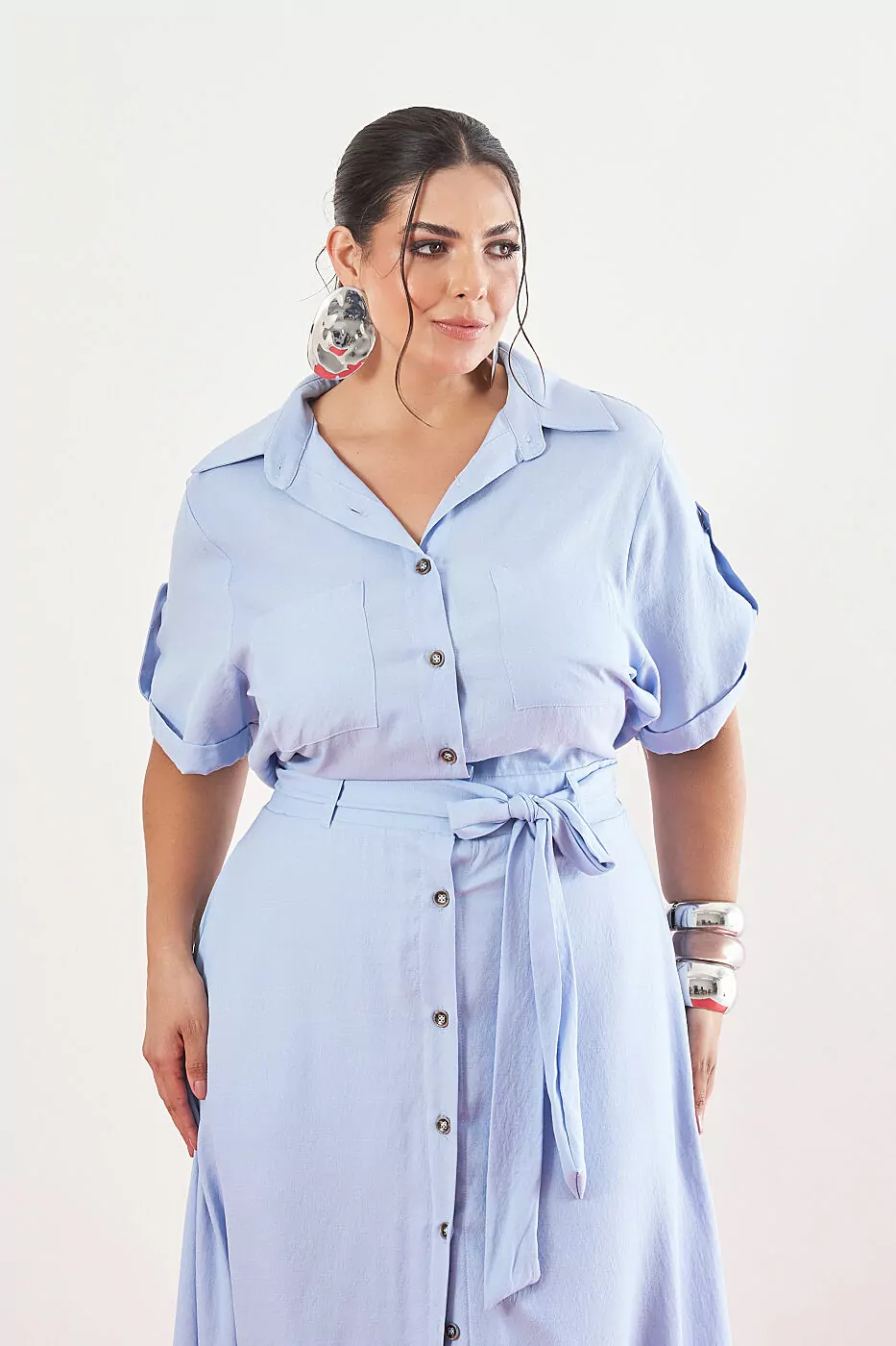 Vestido longo em viscose, possui bolsos frontais, botoes tartaruga na vista, manga com barra italiana e mantigale. Possui pala nas costas com prega e elástico lateral cós costas acompanha faixa para amarração e forro.