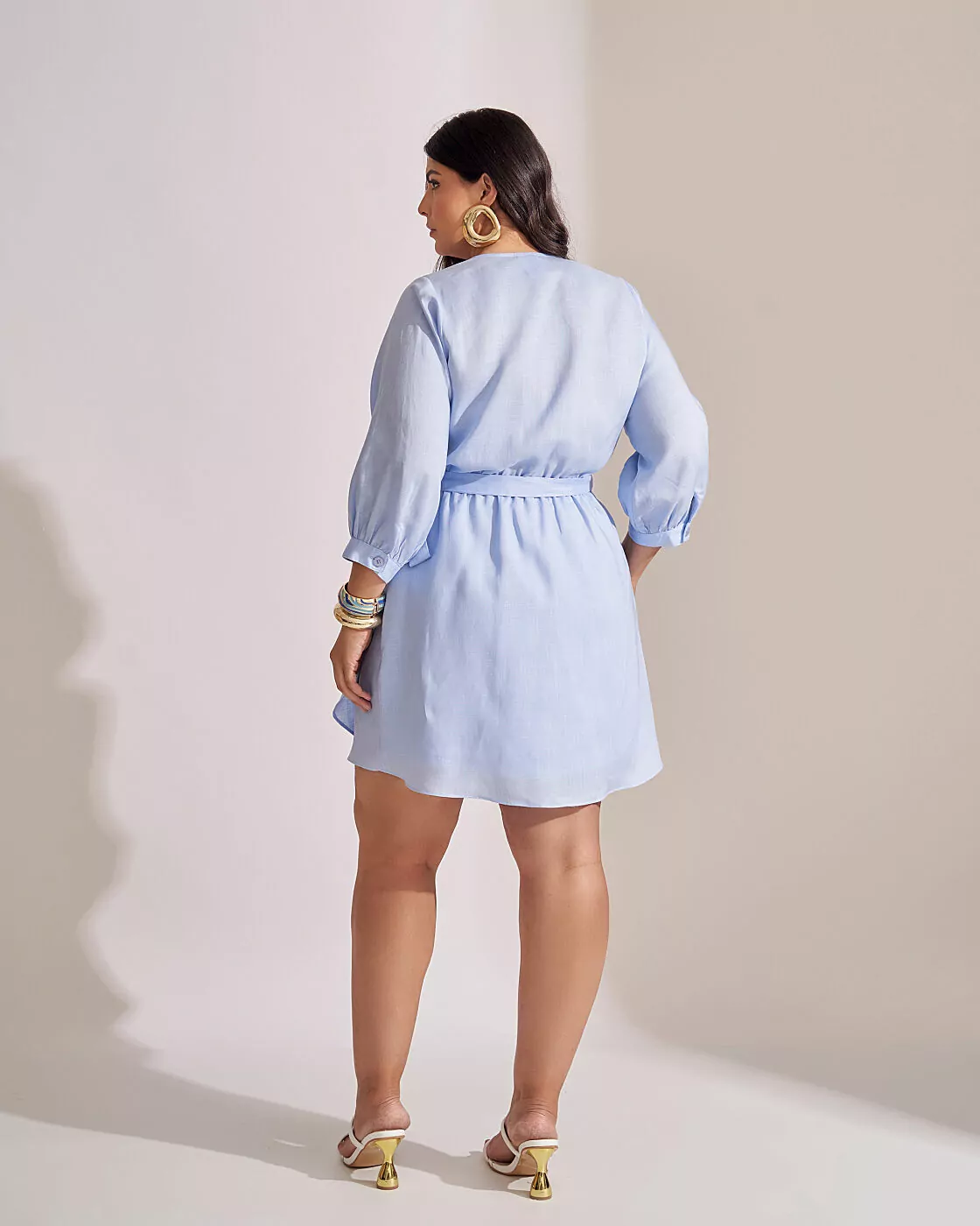 Vestido com mangas ? e decote transpassado. Possui elástico em toda circunferência da cintura. botão tingido no fechamento da manga e possui forro na parte da saia costas.