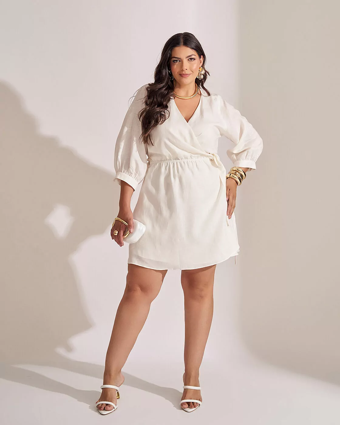 Vestido com mangas ? e decote transpassado. Possui elástico em toda circunferência da cintura. botão tingido no fechamento da manga e possui forro na parte da saia costas.