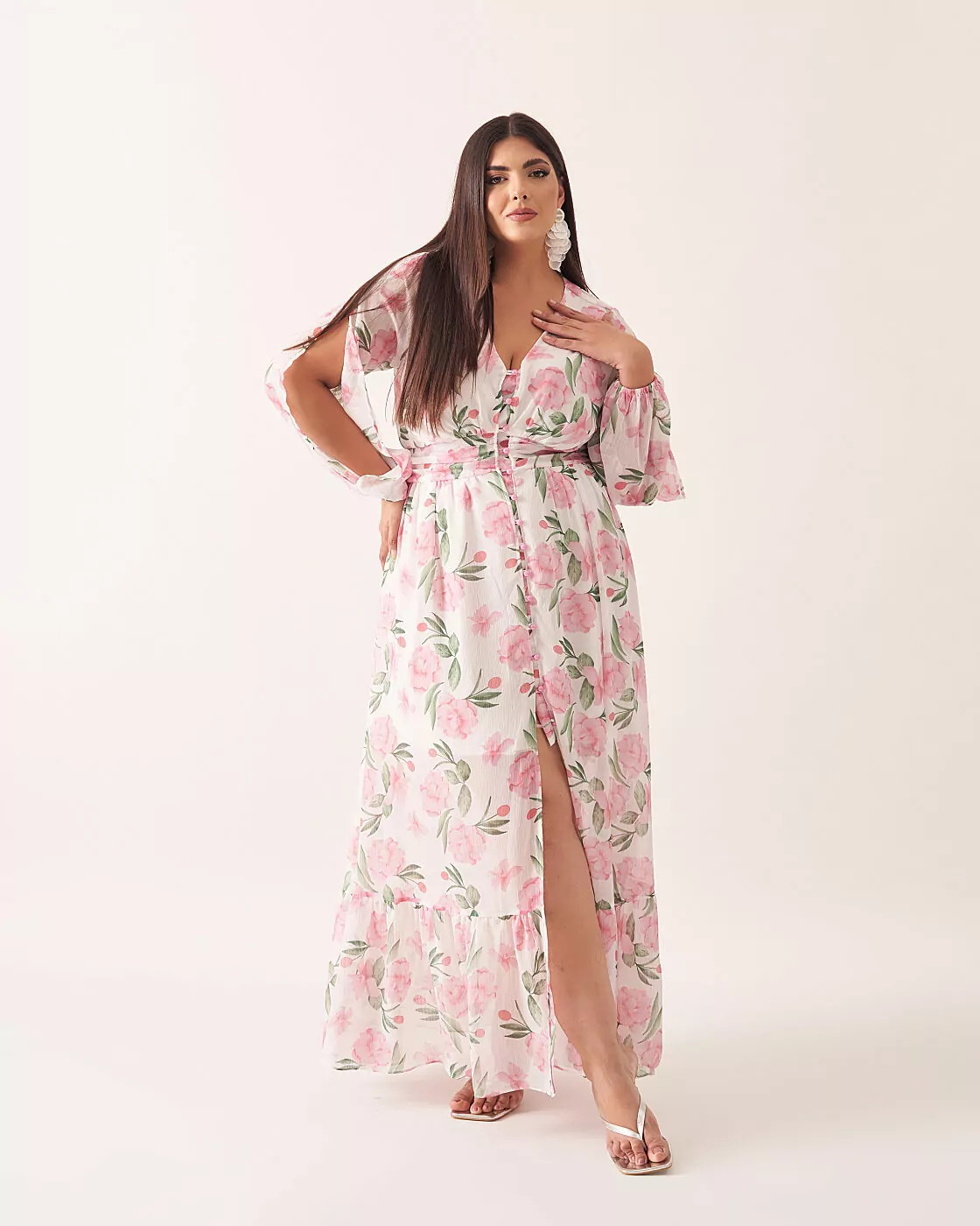 Vestido em chiffon, tecido com leve transparência. Possui botões de pezinho tingido na vista, elástico cós costas e franzido no cós frente. Manga longa com abertura lateral, elástico no punho, barra com recorte e franzido. Possui forro.