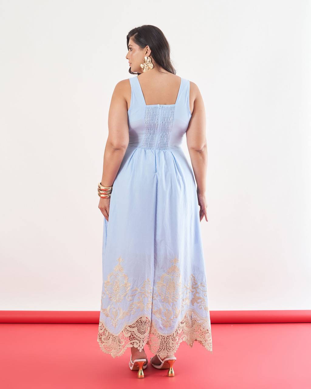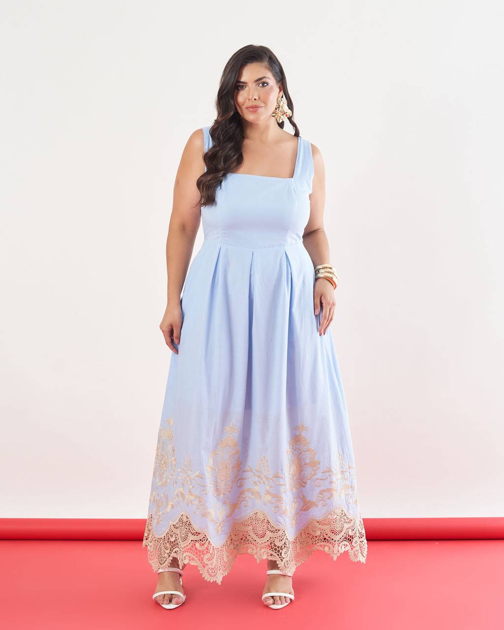 Vestido Midi alongado em algodão, com decote quadrado, recortes drontais no busto. Possui pregas na cintura, saia barrada vazada, bolso invisível, elastex costas e zíper, Possui forro.